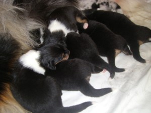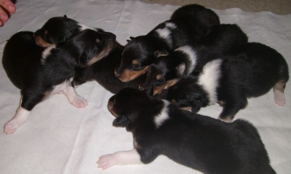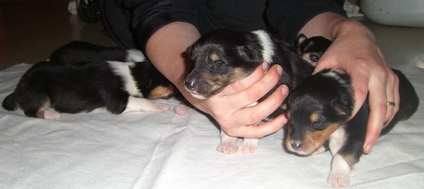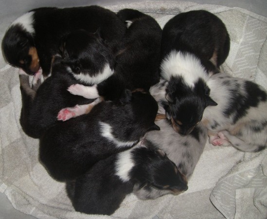 Vorne rechts mit Kopf links: Shadow. Hinter Shadow: Aslan, dann Alex, gefolgt von Smartie. Smartie ist auch beim "Laufen" der erste... naja, er ist zumindest der erste, der so etwas ähnliches zu stande bringt. LInks hebt Arcon schon den Kopf. Über Arcon: Bailey. Die Augen öffnen sich dieser Tage.