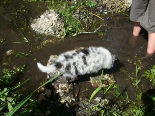 Ein kleiner glasklarer Nebenarm der Singold, der bei uns um die Ecke durch den Stadtpark fließt, ist uns dabei besonders aufgefallen. Aufgefallen deshalb, weil sich kleine Gras- und Schotterinselchen gebildet haben, auf denen Welpen gefahrlos zwar Wasser und outback kennen lernen können, die Gefahr sich zu verdrücken aber nicht gegeben ist.