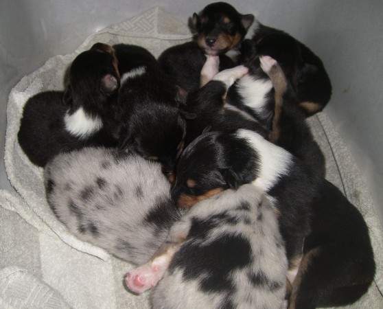 Vorne rechts mit Kopf links: Shadow. Hinter Shadow: Aslan, dann Alex, gefolgt von Smartie. Smartie ist auch beim "Laufen" der erste... naja, er ist zumindest der erste, der so etwas ähnliches zu stande bringt. LInks hebt Arcon schon den Kopf. Über Arcon: Bailey. Die Augen öffnen sich dieser Tage.